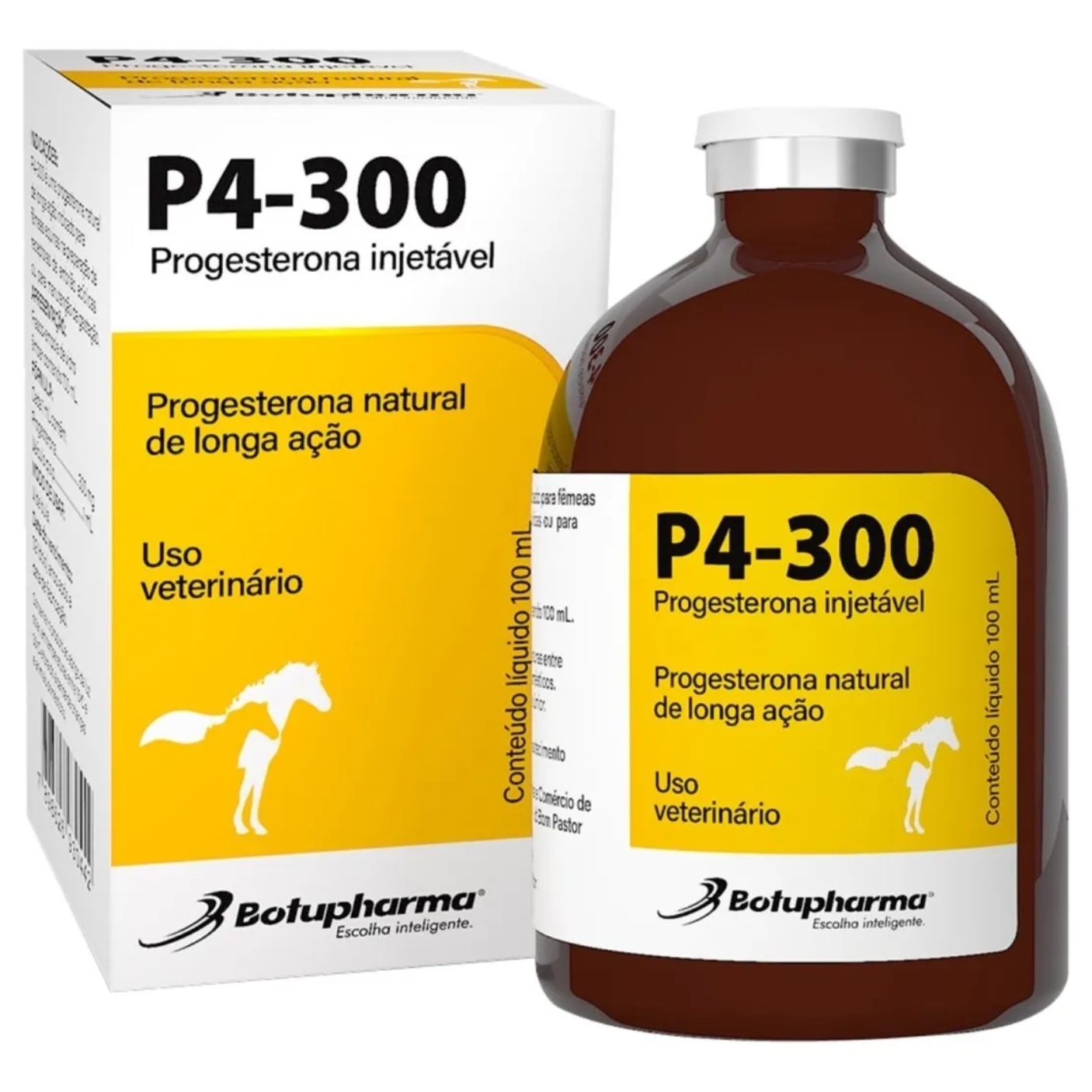 Indicação Progesterona P4-300 é uma progesterona natural de longa ação indicado para fêmeas. É indicada para éguas na preparação de receptoras de embrião acíclicas ou para manutenção da gestação. Fórmula Cada 1 mL contém Progesterona…………..300 mg Veículo q.s.p………………1 mL Modo de usar Via e forma de administração Produto de uso injetável exclusivamente por via intramuscular profunda. Aplicar por via intramuscular profunda 5 mL (1.500 mg) a cada 7 dias ou 10 mL (3.000 mg) a cada 14 dias para manutenção da prenhez. Apresentação Frasco contendo 100 mL.
